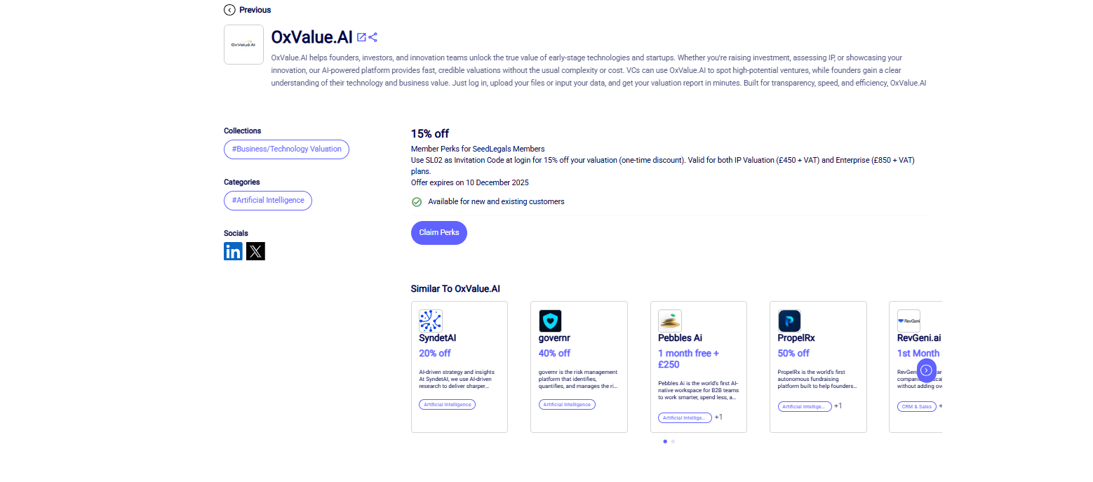 We’re excited to announce that we are now officially part of the leading platform SeedLegals Partner Marketplace, connecting 65,000+ founders and 35,000+ investors across the UK startup ecosystem. Together, OxValue.AI and SeedLegals are bringing AI-driven, data-backed company valuation tools directly to founders and investors, helping them make smarter, faster, and fairer decisions during fundraising and investment.
