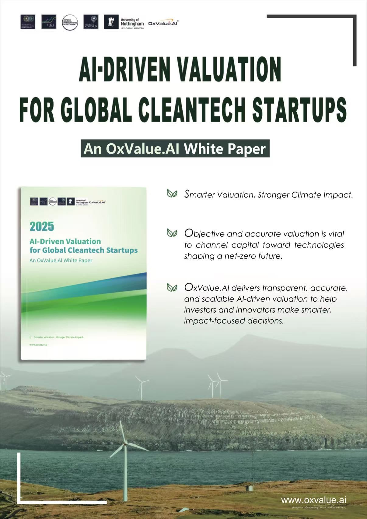 On 11 November, during COP30 in Belém, Brazil, OxValue.AI officially launched its latest white paper, “AI-Driven Valuation of CleanTech Startups.” This publication marks the first valuation framework tailored specifically to cleantech startups, built on the principles of value creation. It aims to accelerate investment into climate innovation, strengthen clean technology transfer, and support countries and regions in capturing the Green Window of Opportunity.